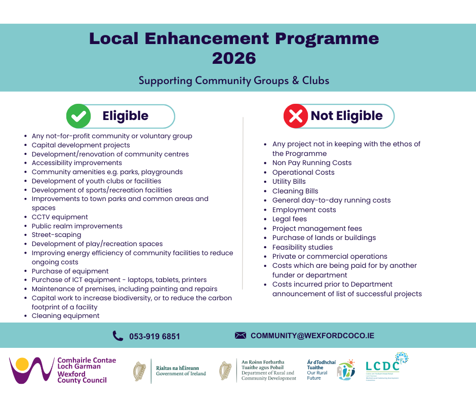 The Local Enhancement Programme (LEP) is funded by the Department of Rural and Community Development and the Gaeltacht (DRCDG), and administered by Wexford County Council (WCC), on behalf of Wexford Local Community Development Committee (LCDC). Please see the following link for a press release from when the funds were announced by the DRCDG.