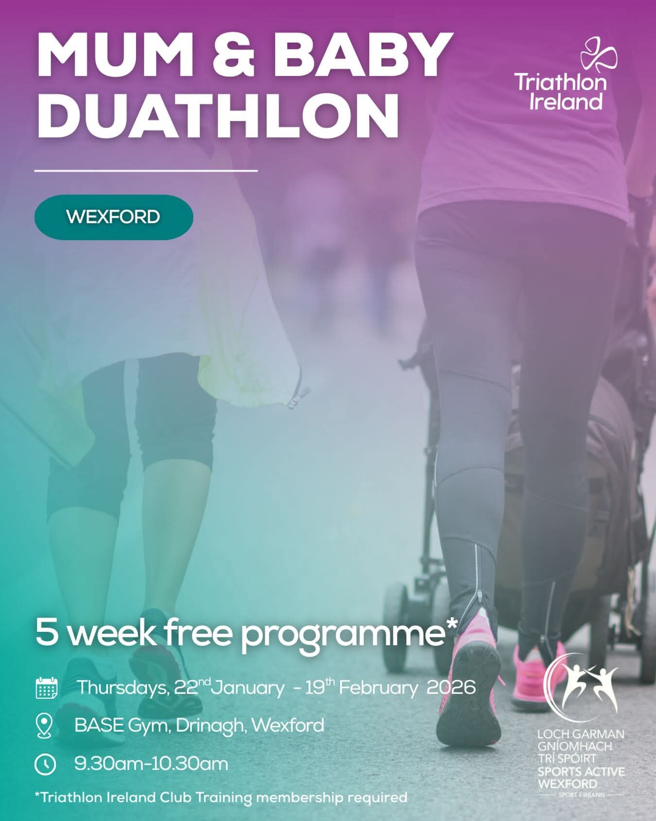 Triathlon Ireland & Sports Active Wexford are offering a free* 5 week Mum & Baby Duathlon Programme starting Thursday 22nd January in Wexford.