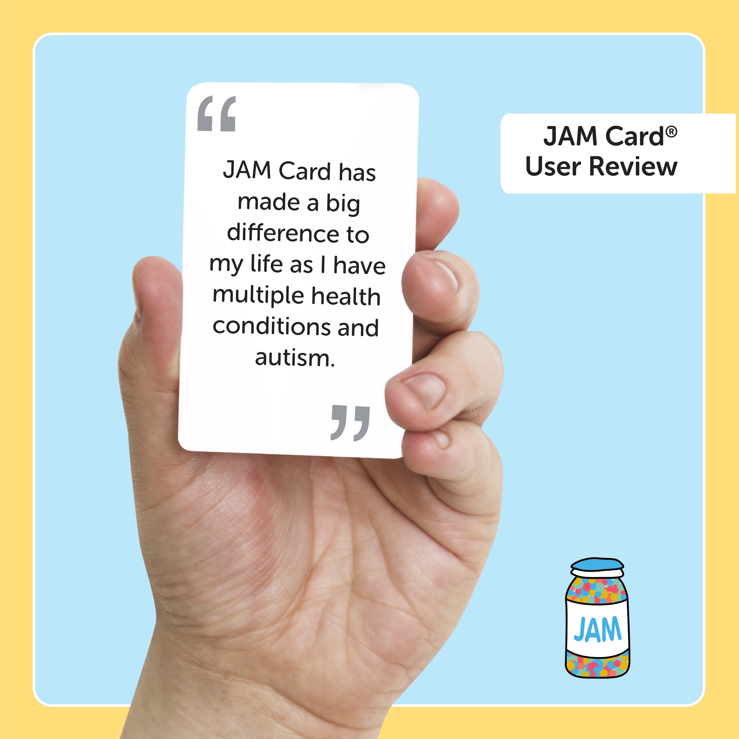 The JAM Card© is a simple and discreet way to break down barriers, making it easy for people with non-visible disabilities to let others know they need ‘Just A Minute’ of patience and support.
