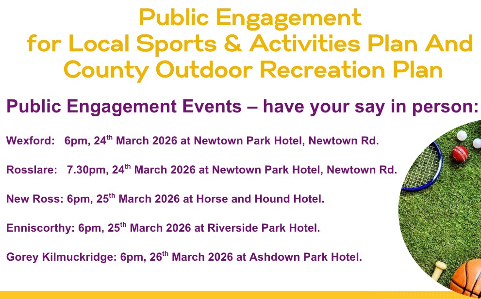 Wexford County Council and Sector 3 Consulting are asking for the public’s help in preparing two plans, The Local Sports and Activity Plan and the County Outdoor Recreation Plan. They are seeking to collaborate with residents, visitors and stakeholders throughout the County to inform the content of these plans.