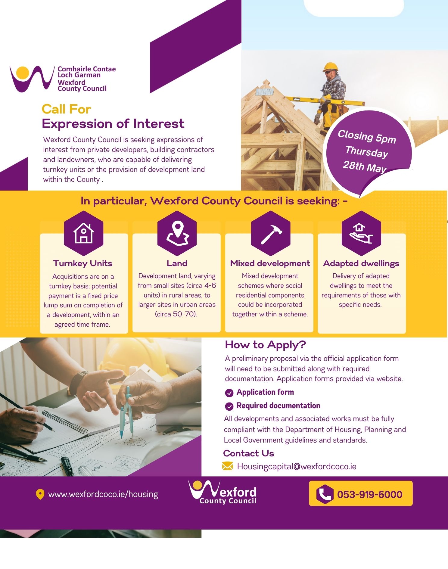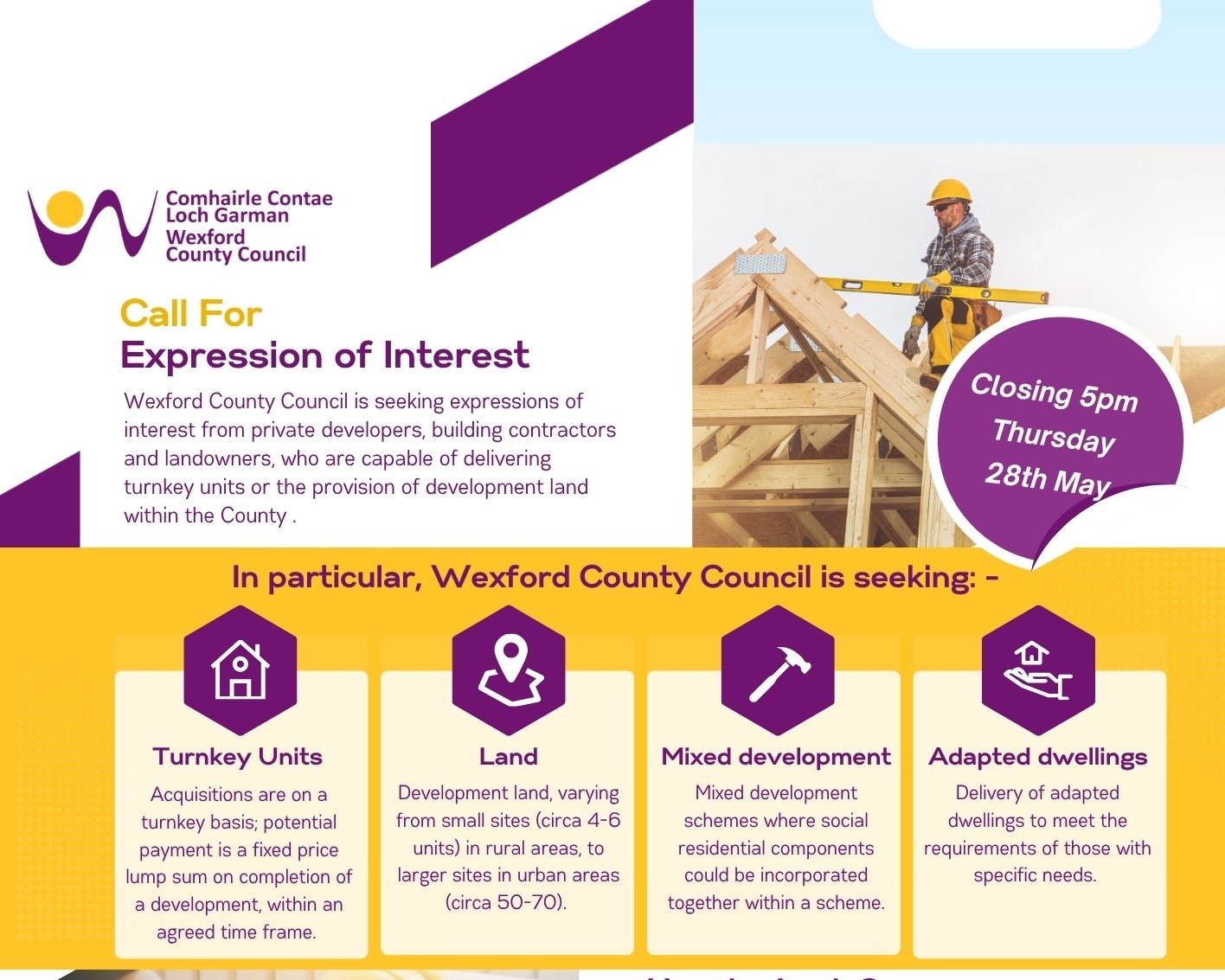 Wexford County Council is seeking expressions of interest from private developers, building contractors and landowners, who are capable of delivering turnkey units, or the delivery of development land withing the county. Closing date: 28th May 2026