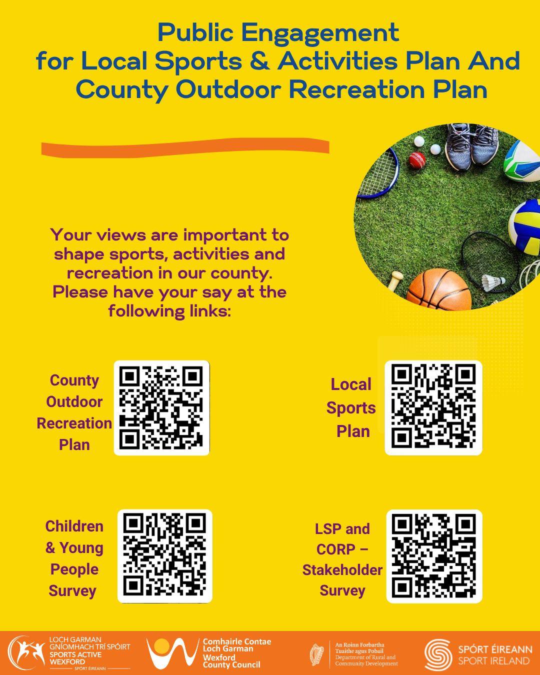 #HaveYourSay on Sports, Activities and Outdoor Recreation in Co. Wexford. The public survey for the Local Sport and Activities Plan and County Outdoor Recreation Plan are still open. Your views are important to ensure that these plans fit with the aspirations of the people of Co. Wexford and those who come to visit. These plans will shape policy, optimise existing assets, maximise development opportunities and leverage funding for the sports, activities and outdoor recreation sectors in the County. Please take our short survey to help inform these plans.