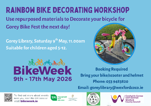 Bring your bike (or scooter) and a helmet to Gorey Library for a fun bike decorating workshop with Clare! We will use mainly repurposed materials to decorate our bikes in all the colours of the rainbow. Bring your colourful bike along to the park the next day for Gorey Bike Fest, and be in with a chance of winning a prize for Best Dressed Wheels! This event is suitable for children aged 5-12. Accompanying grown-ups are welcome to decorate their bikes too! If you need any assistance to participate in this event, contact Gorey Library on 053 648 6820 or email gorey.library@wexfordcoco.ie Time: 11.00am – 12.00pm Date: Saturday 9th May Location: Gorey Library Booking: Registration is required HERE |