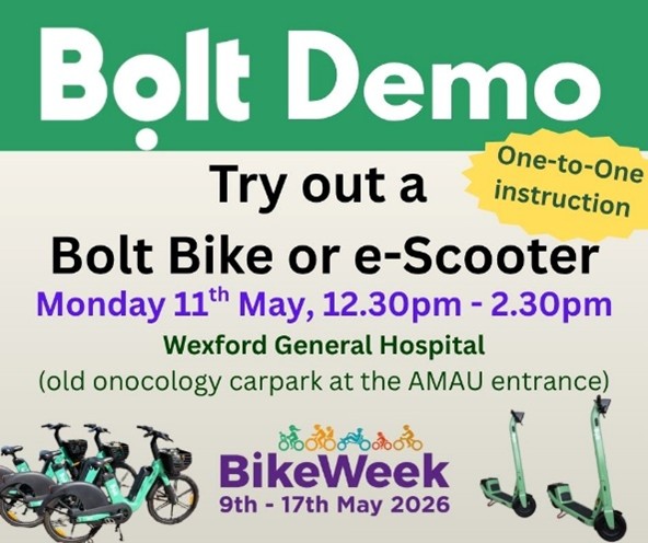 Have you been a little curious but never tried a Bolt bike or scooter? Try one out for free and learn how convenient the Bolt app is to use. One-to-one tuition provided. No app or payment required. Time: Drop by between 12.30pm and 2.30pm Location: Wexford General Hospital (old oncology carpark at AMAU entrance) Other information: No booking required |