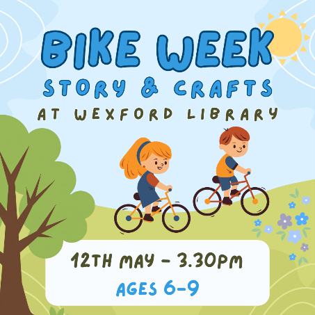 Join us in Enniscorthy Library as we celebrate Bike Week with a fun bicycle themed storytime and craft session! Children will enjoy some fun stories about cycling and make a bike-themed craft to bring home, as well as receiving a FREE Bike Week goodie bag! Perfect for 4-7 years old but fun for everyone! Through the magic of storytelling, children are transported to far-off lands, introduced to diverse characters, and exposed to a rich tapestry of language, all while developing fundamental literacy skills such as vocabulary acquisition, comprehension, and phonological awareness. All welcome and no booking required. Time: 10.30am |