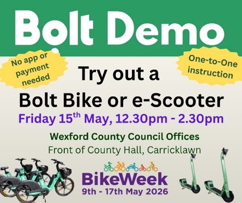 The second of the Bolt Bike Demos - Try one out for free and learn how convenient the Bolt app is to use. One-to-one tuition provided. No app or payment required. Time: Drop by between 12.30pm and 2.30pm Location: Wexford County Council Offices, County Hall, Carricklawn Other information: No booking required. |