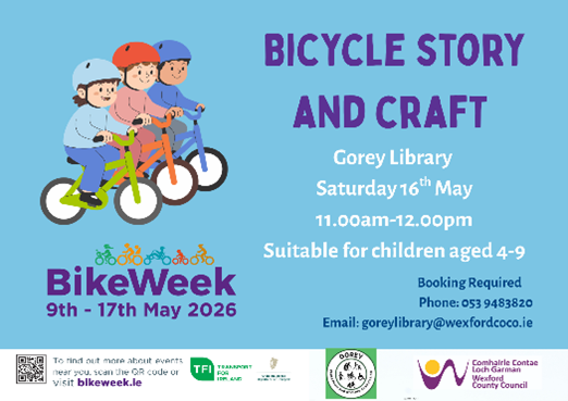 Join Claire for a fun bicycle-themed story and craft session to celebrate Bike Week! This event is suitable for children aged 4-9. If you need assistance attending this event, contact Gorey Library on 053 948 9320 or email gorey.library@wexfordcoco.ie Time: 11.00am – 12.00pm Date: Saturday 16th May Location: Gorey Library Booking: Registration is required HERE |