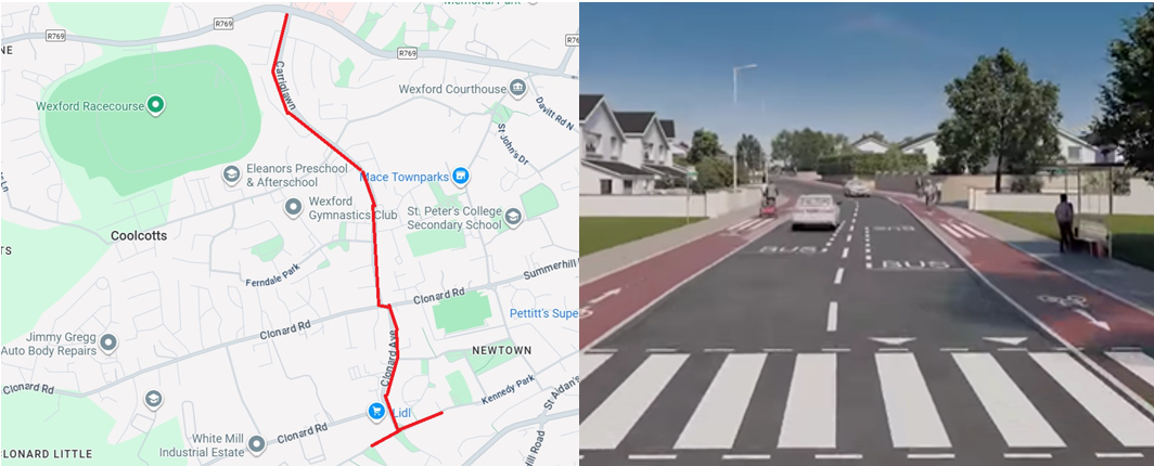 The scheme is approx. 1.7km in length and will connect with the Newtown Road Active Travel Scheme. This pedestrian and cycle route will form a spine across the west side of Wexford Town and provide linkages to a number of schools in the area. It will also serve one of the main residential areas in the town. There are a number of large retail units located to the southern side of the scheme.